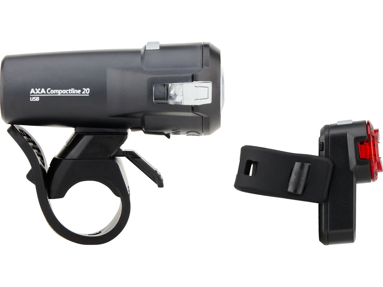Lieferumfang:1 x Frontlicht Axa Compactline 20 USB1 x Rücklicht Axa Compactline Rear2 x Halter Axa1 x USB-Ladekabel Axa