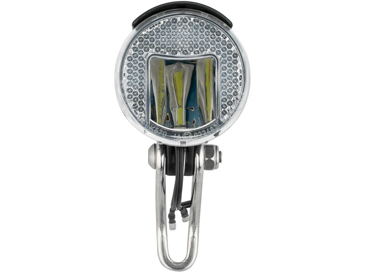 Spezifikationen:Ausführung:Frontlicht (weiß)Montage:Edelstahl LampenhalterLeuchtmittel:1 x LEDLeuchtkraft:40 LuxBetriebsmittel:Nabendynamo, SeitenläuferdynamoTechnische Daten:Material:AluminiumStandlicht:Ja (abschaltbar)Schalter:Ein / Aus / Automatik (Sensor)Freigaben:Zulassung im Straßenverkehr:Ja, für Fahrräder nach §67 StVZOPrüfziffer:K ~~ 570*01Features:spezielle IQ-Lichttechnikmit optimierter Nahfeldausleuchtungmit integriertem Frontstrahlerzur Montage an allen Fahrradtypen geeignetgesonderte Anschlussmöglichkeit für Rücklicht-, Strom- und Massekabelmit integriertem Überspannungsschutzeinschließlich Edelstahl-Lampenhaltermit praktischer Standlichtfunktion dank Kondensatortechnik (über Drehschalter abschaltbar)ergonomisch komplett integrierter Drehschalternur 52 mm Durchmesser und 66 mm Seitenlängeintelligentes Design aus Alu Kühlkörper mit Luftdüsenfür Naben-Dynamo geeignetKomfort durch intelligente Sensortechnikintegrierter Hell-Dunkel-Sensor sorgt dafür, dass bei Dämmerung und Dunkelheit die Lichtanlage automatisch leuchtetzugelassen im Bereich der StVOTechnologien:IQ-Technik
