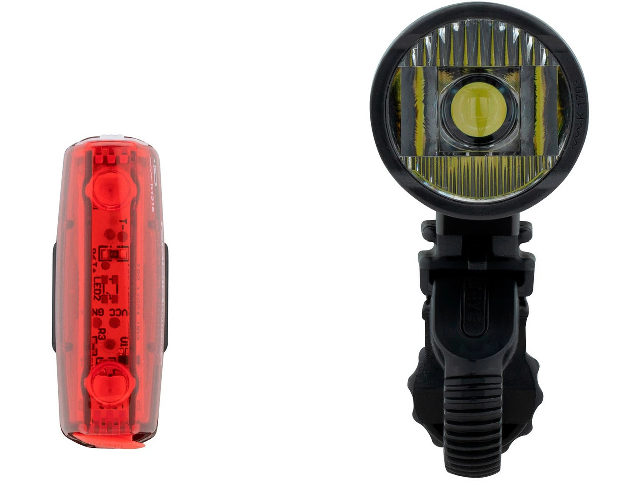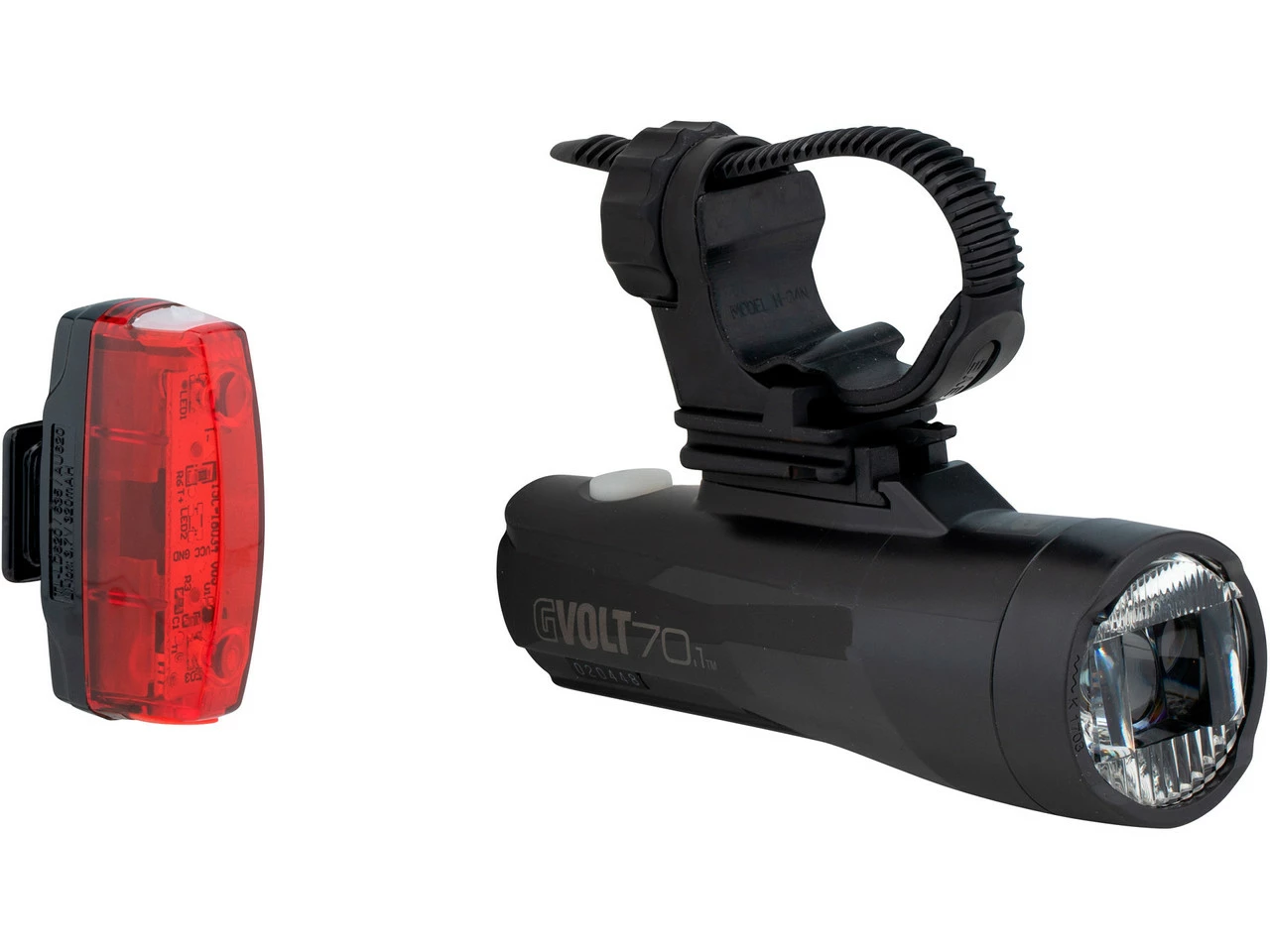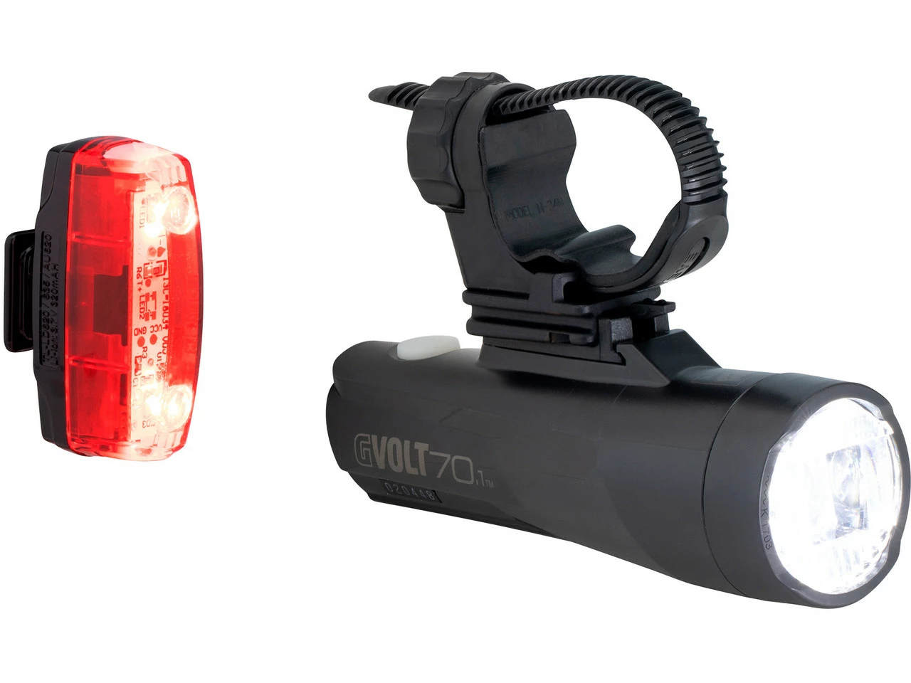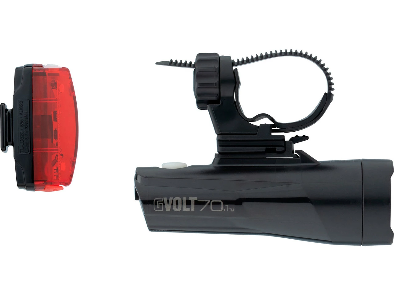 Das GVolt 70.1 Rapid Micro G Beleuchtungsset von CATEYE besteht aus der LED-Frontlampe GVolt 70.1, die mit einer beachtlichen Leuchtkraft, verschiedenen Montagemöglichkeiten und einem breiten Ausleuchtungsfeld überzeugt, sowie aus dem TL-LD620G Rapid Micro G LED-Rücklicht, das sich kompakt und sportlich präsentiert.