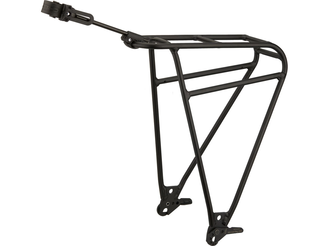 Features:mit Quick-Release-System zur temporären Verwendung an Sporträdern, die auch im Alltag oder für Kurzreisen genutzt werdenin 15 Sekunden montiert, in 5 Sekunden demontiertlediglich unauffällige Auflagepunkte verbleiben am RadAuflagefläche für Top-Lock-Gepäckträgertaschen und -körbe, außen 100 mm breitzwei Einhängeebenen pro Seite für die gleichzeitige Anbringung von z. B. Korb und seitlicher Radtaschesehr leichtwird oben mittels längenverstellbarer Strebe an Sattelstütze oder Sitzrohr befestigt, zwei Strebenlängen im Lieferumfang (extralange Befestigungsstrebe mit 300 mm Länge)Klemmung an Sattelstütze oder Sitzrohr für Durchmesser von 20 – 40 mm geeignetwird unten an M5- oder M6-Ösen am Ausfallende befestigt, alternative Befestigung mit Seat Stay Adapter an Sitzstreben möglich (nicht im Lieferumfang)mit Aufnahme für unverkabeltes RücklichtHalterungselemente für QL3/3.1-Taschen können je nach Bedarf an- oder abgeschraubt werdenHerstellernummer:F78104