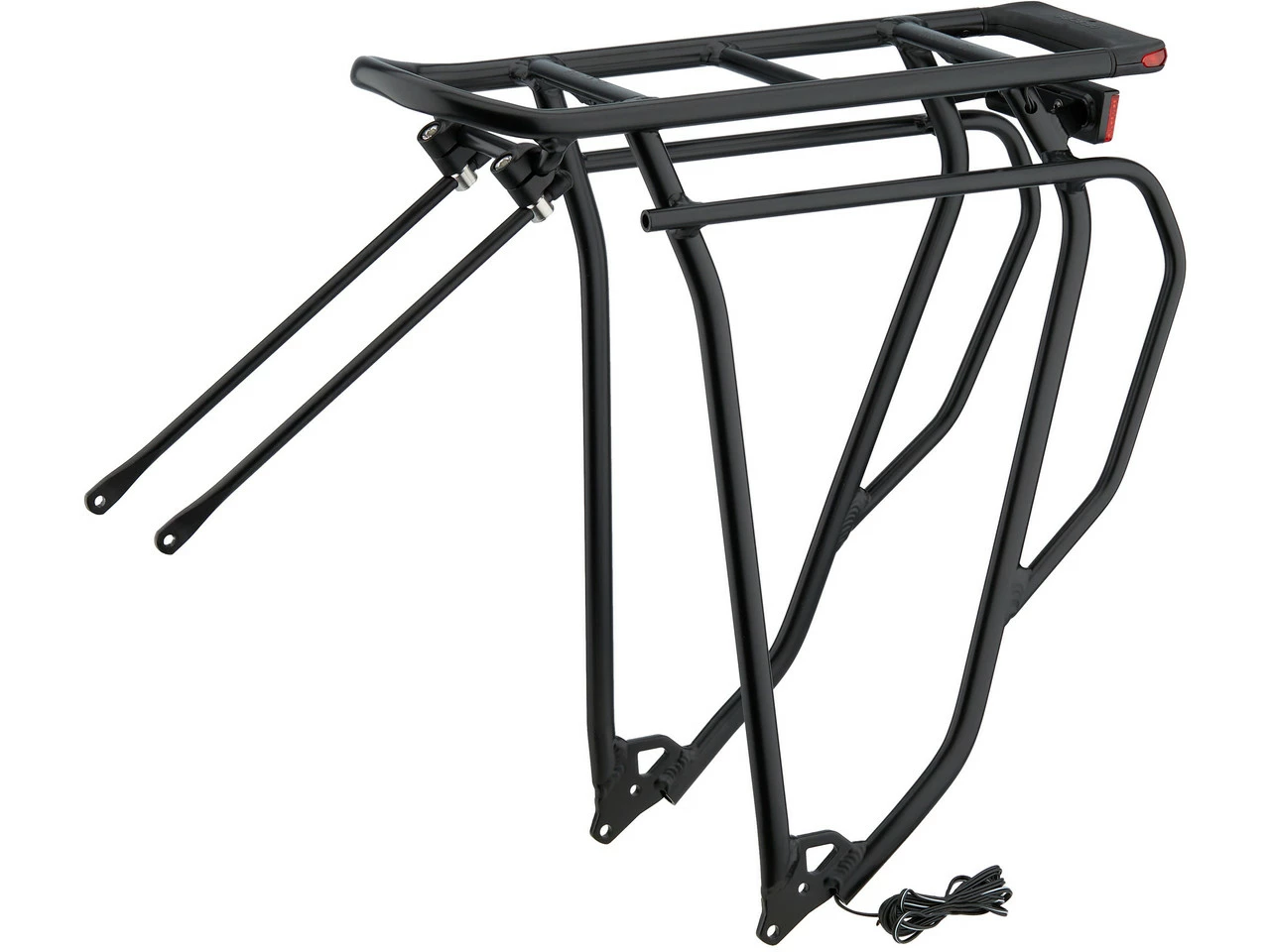 Spezifikationen:Einsatzbereich:City, Touring & TrekkingBefestigung oben:HinterbaustrebenbefestigungBefestigung unten:Strebenbefestigung an RahmenausfallendeLaufradgröße:26″ – 28″ , 28″ – 29″Strebendicke:14 mmZuladung (max.):25 kgKompatibilität:Snapit 2.0Ausführung Licht:Rücklicht (rot)Leuchtmittel:LED (2)Betriebsmittel:Nabendynamo, SeitenläuferdynamoTechnische Daten:Material:AluminiumSpannung:6 VoltStandlicht:Ja (nicht abschaltbar)Freigaben:Zulassung im Straßenverkehr:Ja, für Fahrräder (nach §67 StVZO)Prüfziffer:K~~1726Features:schlichter Gepäckträger mit Gepäckrelings für die Festmontage an Fahrrädern mit Dynamointegriertes Rücklicht von Trelockeinfache Ausrichtung am Rahmen dank längenverstellbarer Hinterbaustrebenbreite Gepäckfläche mit Snapit-2.0-AufnahmeFeatures:Herstellernummern:26″ -28″:090822-00228″ -29″:090821-002Lieferumfang:1 x Gepäckträger Racktime Gleamit 2.0 Tour mit Rücklicht für Dynamobetrieb4 x Unterlegscheibe M52 x Schraube M5 x 16 mm2 x Klemmblock2 x Schraube M6 x 14 mm2 x Endstopfen2 x Hinterbaustrebe4 x M5 x 12 mm2 x Schrumpfschlauch2 x Kabelschuh1 x Lichtkabel 2-adrig