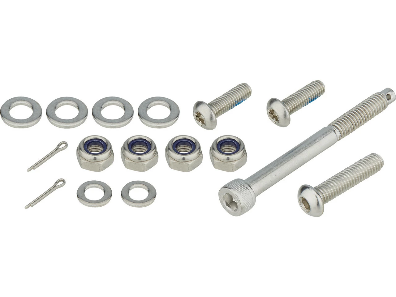 Lieferumfang:1 x Gepäckträger Racktime Topit 2.02 x Schraube M6 x 16 mm1 x Schraube M6 x 25 mm2 x Schraube M5 x 16 mm1 x Schraube mit Splintloch M6 x 60 mm2 x Splint7 x Unterlegscheibe M62 x Unterlegscheibe M51 x Distanzring7 x Mutter M61 x Montageblech1 x Scheinwerferhalter
