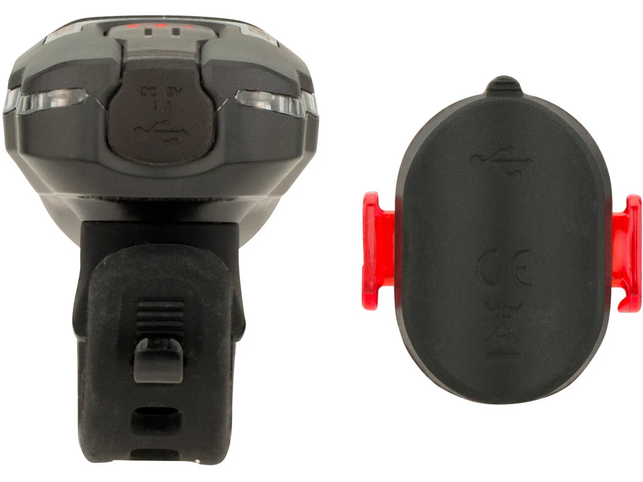 Spezifikationen Frontlicht:Ausführung:Frontlicht (weiß)Montage:LenkerLeuchtmittel:Osram LEDLeuchtkraft:80 LUX (Standard-Modus), 60 LUX (Mid-Modus), 40 LUX (Low-Modus), 20 LUX (Eco-Modus)Leuchtdauer:4 Stunden (Standard-Modus), 5 Stunden (Mid-Modus), 6,5 Stunden (Low-Modus), 15 Stunden (Eco-Modus)Leuchtweite:90 mBetriebsmittel:Akku (Li-Ion), integriertTechnische Daten Frontlicht:Leuchtmodi:Standard-Modus, Mid-Modus, Low-Modus, Eco-ModusLadestandanzeige:5 stufige Akku-Indikator-AnzeigeLadezeit:4,5 StundenSchutzklasse:Spritzwassergeschützt nach IPX4Material:KunststoffStandlicht:Ja (abschaltbar)Schalter:Ein / AusFreigaben:Zulassung im Straßenverkehr:Ja, für Fahrräder (nach §67 StVZO)Prüfziffer:K~~1500Features Frontlicht:werkzeugfreie Montagesehr gute seitliche Sichtbarkeit durch Light Guideintegrierte Micro-USB Ladefunktion360° verstellbare HalterungEinschaltschutz (Doppelklick für AN)Aufladen während des Betriebes möglichSpezifikationen Rücklicht:Ausführung:Rücklicht (rot)Montage:Sattelstütze, StrebenLeuchtmittel:LEDLeuchtdauer:6 StundenBetriebsmittel:Akku (Li-Ion), integriertTechnische Daten Rücklicht:Leuchtmodi:StandardmodusLadestandanzeige:Zweistufiger Akku-/LadeindikatorLadezeit:2 StundenSchutzklasse:IPX4Material:KunststoffStandlicht:Ja (abschaltbar)Schalter:Ein / AusFreigaben Rücklicht:Zulassung im Straßenverkehr:Ja, für Fahrräder (nach §67 StVZO)Prüfziffer:K~~1377Features Rücklicht:Sichtweite von 400 mwerkzeugfreie Montage mit O-Ring-Halterungseitliche SichtbarkeitTechnologien:Micro-USB Ladefunktion: