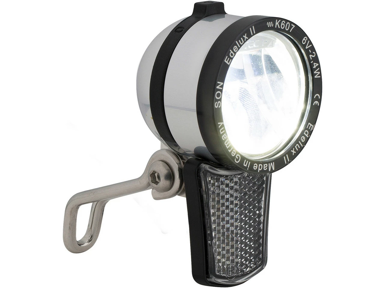 Spezifikationen:Ausführung:Frontlicht (weiß)Montage:Lenker (140 cm Kabel) oder Gabelkopf (60 cm Kabel)Leuchtmittel:LED (1)Leuchtkraft:100 LuxBetriebsmittel:NabendynamoTechnische Daten:Material:Aluminium (6082-T6)Standlicht:Ja (nicht abschaltbar)Schalter:Ein / Aus / Automatik (Sensor)Freigaben:Zulassung im Straßenverkehr:Ja, für Fahrräder (nach §67 StVZO)Prüfziffer:K~~607Features:100 Lux auf 10 m Distanz, 35 km/h3 Watt Hochleistungs-LED (>100 lm/W)30 % mehr Lichtbreites, homogenes Lichtfeldrobustes AlugehäuseKondensator-Standlicht und Lichtsensor-AutomatikSchaltring mit Magnet, Reed-Kontaktsolide mechanische und elektrische AusführungSchalter und Gehäuse spritzwasserdichteffizient und schonend betriebene LED durch optimale Kühlung mittels Kupfer-KühlkörperKoaxialkabel, PVC-frei, 3 mm DurchmesserKabellänge 60 cm (anschlussfertig für Son) oder 140 cm (mit losen Kabelschuhen)Rücklichtanschluss Flachstecker 2,8 mm und Ringkabelschuh (beiliegend)O-Ring-Dichtung (2x), Elektronik vergossenkann auch mit Seitenläuferdynamo betrieben werdenMade in TübingenFinish eloxiert oder poliertHerstellernummern:schwarz-eloxiert 60 cm:680615schwarz-eloxiert 140 cm:681416silber-poliert 60 cm:680605silber-poliert 140 cm:681406rot-eloxiert 60 cm:680625rot-eloxiert 140 cm:681426silber-eloxiert 60 cm:680695silber-eloxiert 140 cm:681496blau-eloxiert 60 cm:680645blau-eloxiert 140 cm:681446Lieferumfang:1 x Frontscheinwerfer SON Edelux II1 x Scheinwerferhalter SON Edelux1 x Anbaureflektor1 x Anschlussmaterial-Set